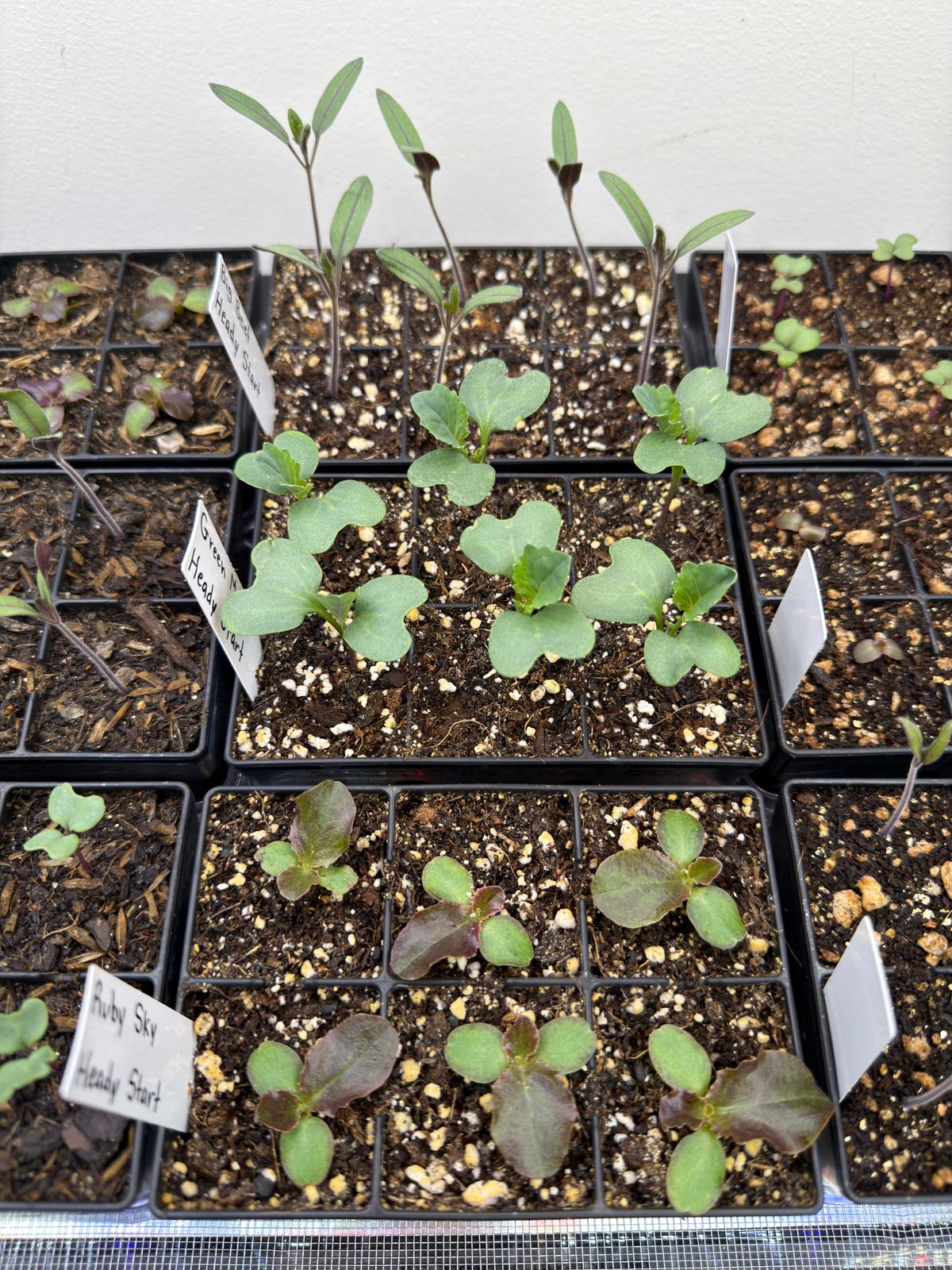 2. In my ongoing seed-starting media experiment, I am testing 4 premium bagged mixes and my own homemade mix to see which one produces the largest, healthiest seedlings in a controlled environment. All of the seeds were planted at the same time, and they are subjected to the same ambient temperature, humidity, airflow, lighting, and are planted in the same trays — the only thing changing is the medium used.